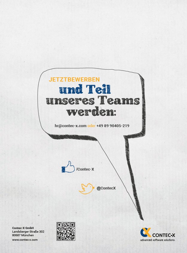 JETZT BEWERBEN @ContecX /Contec-X Contec-X GmbH Landsberger Straße 302 80687 München www.contec-x.com und Teil unseres Teams werden: hr@contec-x.com oder +49 89 90405-219